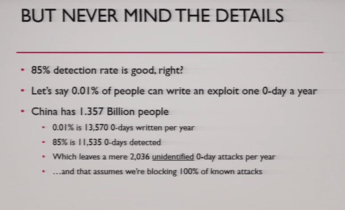So therefore there will be 13,570 0-days written in a year. So let’s say 85% of these 0-days are caught by our defenses because the attack looks similar to a current known virus (which we detect) or otherwise effect.