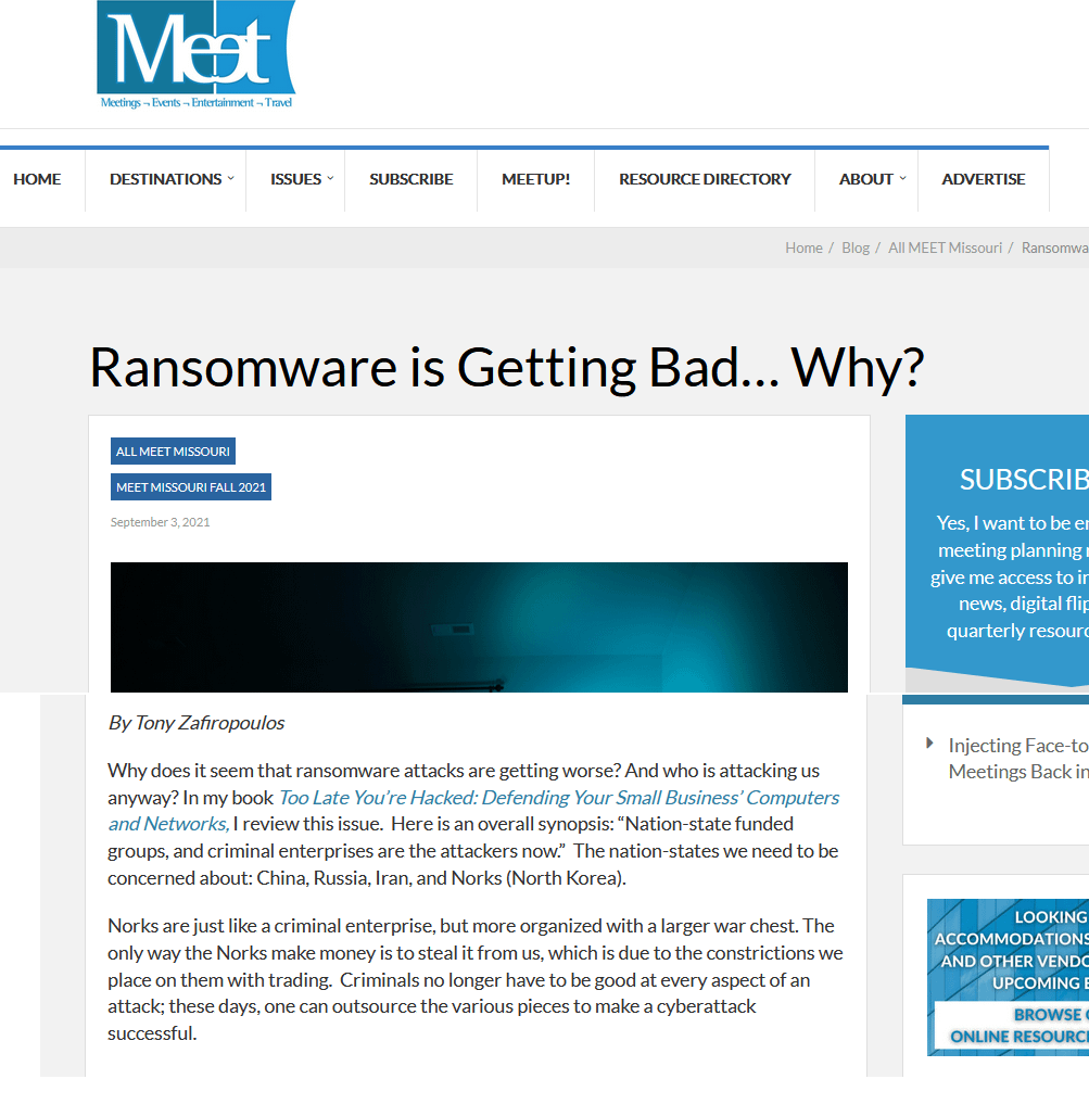 Media noticeby tonyzSeptember 13, 2021May 19, 2022 I was given a task to write a small article for the Meet magazine Fall2021 edition and it has arrived: https://meetmags.com/ransomware-prevention/