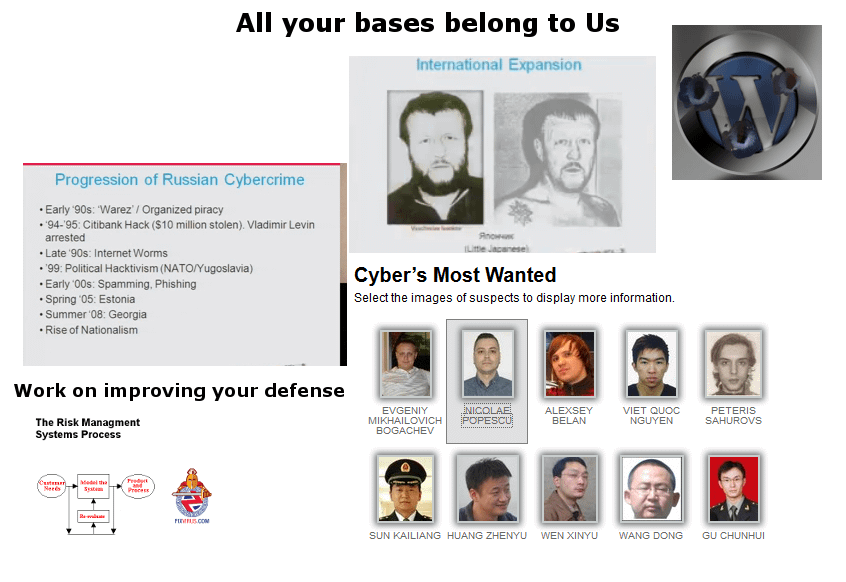 These criminals have honed their skills. “All Your Bases belong to Us” is a video gaming term – where 2 gamers are fighting each other and attempt to take over their opponent’s bases, the term mean that when it was first used but it has morphed as many other things have on the net.